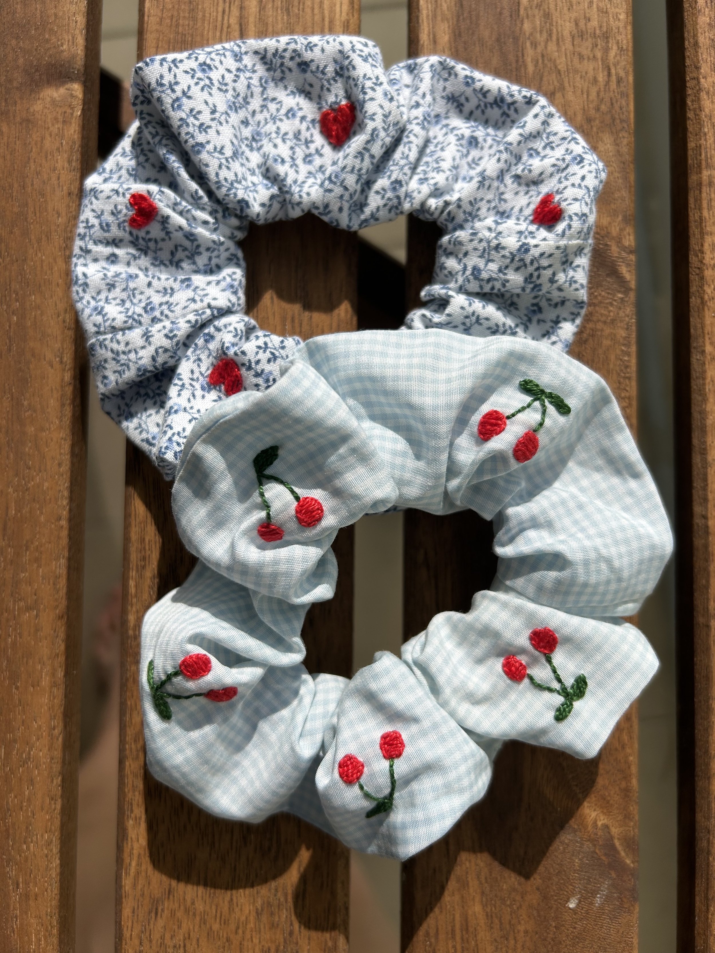Un coeur brodé vient décorer le centre de la trousse. Les marguerites brodées viennent cacher des tâches présentes sur le tissu rayé, découvertes après la couture du patchwork.